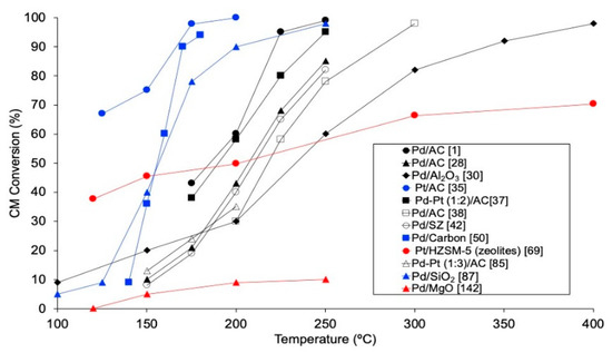 The catalytic activity does not only depend on the active phase. The metal–support interaction is a key factor regarding the activity and selectivity [48,49]. Different porous materials with high surface area have been used as supports, allowing a good dispersion of the active phase [94]. As can be seen in Figure 2, activated carbon [1,23,28,29,31,33,34,35,36,37,38,39,47,48,49,61,68,80,85,89,95,96,97], alumina [19,24,30,40,44,51,54,55,56,57,65,66,68,86] and silica [59,68,87,92,98] have been the most commonly used supports for the HDC of chloromethanes in the last 25 years. N-doped supports have shown high hydrogen spillover, useful for the HDC of other chlorinated compounds (1,2-dichloroethane). As observed with Ni catalysts over N-doped porous carbon [99], this feature of the support may affect the selectivity [100,101,102].