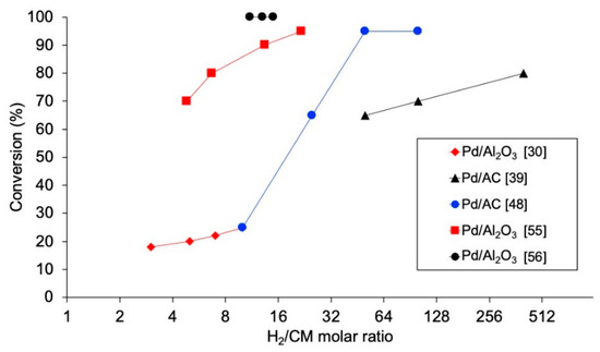 In addition to being a key condition for the economy of the process, the concentration of H2 used is critical, since it may affect the catalytic activity and stability, and may favor the production of different compounds. The influence of the molar ratio H2/chloromethane has been investigated in several studies [30,32,39,48,55,56,70,71], observing that increasing the concentration of H2 entails a higher conversion of the chloromethane (Figure 4). Nevertheless, this effect is not equally intense for low and high ranges of this variable. De Pedro et al. [39] studied the HDC of DCM with Pd/C, finding a remarkable development of the DCM conversion when increasing H2/DCM up to 100, while increasing this variable from 100 to 400 showed only a minor improvement of DCM conversion. In the same reaction at 250 °C, increasing the molar ratio of H2/DCM from 3 to 10 led to a DCM conversion increase from 45% to 60% [30], while an increase from 40 to 400 was needed for an additional increment of DCM conversion to 80% [39]. Complete TCM conversion might be obtained (from 44%) with the same catalyst at 125 °C if the molar ratio of H2/TCM was increased from 50 to 100 [48,49], and in the HDC of TTCM, increasing the molar ratio of H2/TTCM from 5 to 15 caused an increase in TTCM from 78% to 95% [70]. Regarding the selectivity, a higher concentration of H2 helps the hydrogenation of the chlorinated reactant [48,56,76]. This might be used to favor the production of non-chlorinated products (in the HDC of TTCM with Pt catalysts, a small increase in H2/TTCM molar ratio from 5 to 10 led to a remarkable increase in selectivity to CH4, C2H6 and C3H8 from 57% to 84% [76]) or the production of TCM from TTCM (selectivity to TCM increased from 69% to 74% when increasing the H2/TTCM ratio from 9 to 15 [56]). In addition, the proportion of paraffinic to olefinic products obtained may be strongly affected by the ratio H2/CM. Olefins have been identified as intermediate products in the HDC, which may further incorporate additional hydrogen to form the corresponding paraffinic hydrocarbons [1]. Thus, decreasing the proportion of H2 used would favor the production of light olefins [48].
