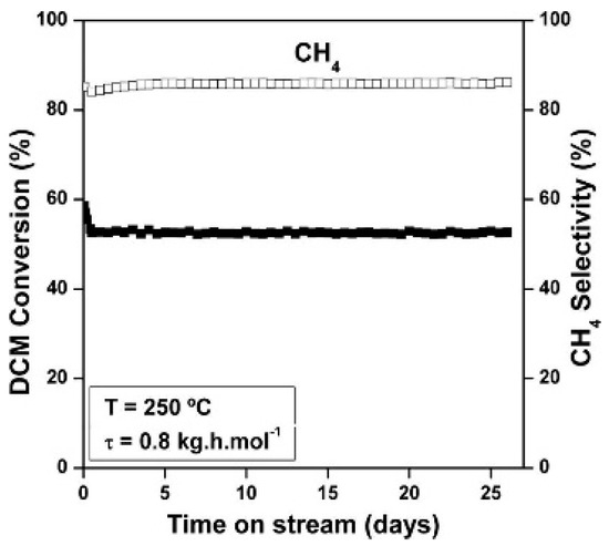As reported in previous sections, there exist several catalysts capable of providing high conversions of chloromethanes. However, stability is another important factor for measuring the feasibility of the catalysts for industrial applications. Though most of reported HDC catalysts show a significant deactivation after a few hours of operation, some catalysts can be found showing significant stability during the HDC of chloromethanes. Several studies have demonstrated that Pt-based catalysts could perform with outstanding stability during the HDC of DCM and TCM with moderate reaction conditions [1,21,31,35,36,42]. In general, Pt shows better stability when compared to other noble metals like Pd, Rh and Ru, even though Pd and Rh usually give rise to higher conversions [1,29,31,36]. In the HDC of DCM [35], a Pt/C catalyst provided ca. 55% stable conversion of DCM during more than 26 days under continuous operation at 250 °C (Figure 5). This catalyst showed a potential resistance to deactivation, attributed to the re-dispersion of the Pt particles during the HDC, making it feasible for industrial applications. The addition of Pt to a Pd catalyst allowed the increasing of its stability in the HDC of chloromethanes, maintaining high conversions [21,42,85]. Bedia et al. [42], reported a Pt-Pd catalyst supported on sulfated zirconia which maintained nearly 80% of DCM conversion for 80 h.