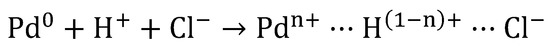The oxidation state of the active centers has been revealed as critical in the catalyst performance. In general, the active centers present a dual nature, being constituted by zero-valent (M0) and electro-deficient (Mn+) active centers. Both species have demonstrated their importance for the HDC [1,21,23,28,29,31,32,33,34,35,36,37,42,43,46,48,49,51,80,83,85,89,127,128,129,130,131]. Mn+ species are usually originated by the interaction of metal particles with the support surface, as a consequence of the presence of different surface groups or those originated by the interaction with metal precursor during catalyst preparation. According to the mechanism showed in various studies [35,89,132], the use of acid solutions of Pd chloride for the preparation of Pd catalysts leads to the formation of tetrachloropalladic acid (H2PdCl4). The adsorption of H2PdCl4 on the support liberate protons. Furthermore, the interaction of these electrophilic protons with the neighboring electron-donating Pd0 atoms, induces the formation of Pdn+ species, which are stabilized by the Cl- remaining on the catalyst surface (Scheme 1).