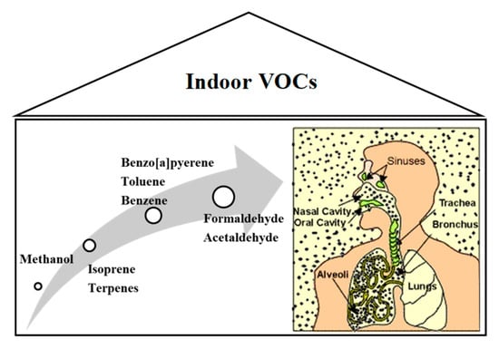 The assurance of good-quality conditions in the indoor air has started to be a subject of many discussions and a wide area of the research studies. Recently, people spend much time inside rooms, and they are exposed to some of the pollutants (mostly VOCs—Volatile Organic Compounds), which are generated by the biological activity of human/animal beings but are also released from the building materials. These VOCs are suspected to induce so-called Sick Building Syndrome, which causes numerous health problems, such as headache and eye, nose, and throat irritation []. The effect of the polluted indoor air on human health is schematically illustrated in Figure 1.
