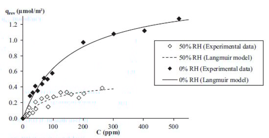 From Figure 5, it can be observed that the reversible quantity (qrev) of acetaldehyde in dry air was around 3 times higher than in the conditions of high relative humidity (RH = 50%).