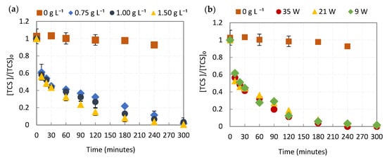 Figure 1a shows time courses of TCS concentration under different TiO2 doses, using UV-A LEDs. First, an experiment without catalyst was carried out, and as can be observed, almost no degradation of triclosan was produced. Moreover, no influence in TCS degradation was found within the studied range of TiO2 concentrations. Experimental data are represented together with error bars, which were obtained after replication of the experiments. Figure 1b shows the change in TCS concentration for different values of light power, again with a very small influence of this variable. By working at the maximum power at which TCS is not degraded by photolysis (35 W), we guarantee working with the maximum photon flux.