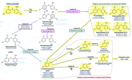 - Constantin, L.A.; Nitoi, I.; Cristea, N.I.; Constantin, M.A. Possible degradation pathways of triclosan from aqueous systems via TiO2 assisted photocatalyis. J. Ind. Eng. Chem. 2018, 58, 155–162. [Google Scholar] [CrossRef]