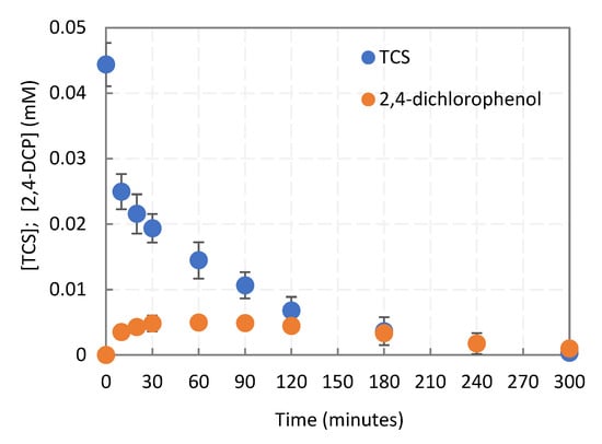 In order to follow the change in the concentration of the parent TCS and the photocatalytically obtained derivatives, different samples were withdrawn at selected time values (10; 30; 60; 90; 130; 180; and 300 min) and the procedure described in the experimental section was followed. Figure 3 depicts the time courses of TCS and 2,4-dichlorophenol concentration, with the corresponding error bars, representing the standard deviations of four replicates. 2,4-Dichlorophenol showed the highest concentration of all identified derivatives; it was produced gradually, reaching a maximum value of approx. 0.0049 mM and then the concentration started decreasing smoothly.