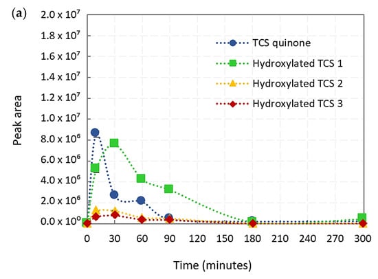 Figure 4a shows the time courses of HIC derivatives (detailed in Table 1) in terms of peak area. TCS quinone and hydroxylated TCS 1 presented much higher peak areas than hydroxylated TCS 2 and TCS 3; besides, TCS quinone was formed faster than hydroxylated TCS; all of them reached a maximum and then decreased. Negligible signal was obtained for all the compounds after ca. 180 min.