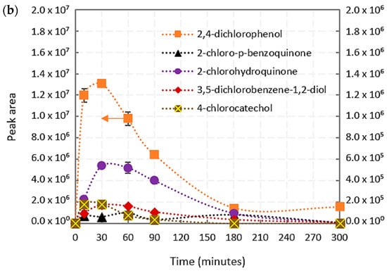 Figure 4b depicts peak areas of LOC derivatives; 2,4-dichlorophenol presented the highest peak area of all and, in contrast, the lowest area value of LOCs belongs to 2-chloro-p-benzoquinone. The trend was similar to that observed for HIC derivatives; LOCs were formed, reached a maximum around 30 min and then started decreasing until almost complete disappearance.