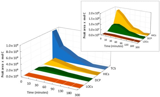 After identifying TCS derivatives and in order to proceed with the kinetic modeling, a carbon balance was carried out, by multiplying the peak area of each compound by its corresponding number of carbon atoms. This facilitated the expression of the concentration of the different derivatives in terms of the number of carbon moles. Additionally, for the best treatment of the data, the concentrations of HICs (hydroxylated TCS 1, 2 and 3) were added, obtaining a lumped value, ΣHICs; the same procedure was followed with LOC derivatives (2-chloro-p-benzoquinone, 2-chlorohydroquinone, 3,5-dichlorobenzene-1,2-diol and 4-chlorocatechol), to obtain ΣLOCs, excluding 2,4-dichlorophenol due to its higher concentration. TCS degradation occurs while the other compounds appear, with HICs being the first group of derivatives formed during the photocatalytic oxidation of TCS, reaching the maximum value in the interval of 10–30 min, then 2,4-dichlorophenol was formed. This compound increases until a maximum around 30 min and then decreases. Finally, LOCs have a similar tendency, although with lower peak areas, as can be seen in Figure 5. To the extent of the authors’ knowledge, there has been no previous research about the kinetic model considering the formed intermediate derivatives.