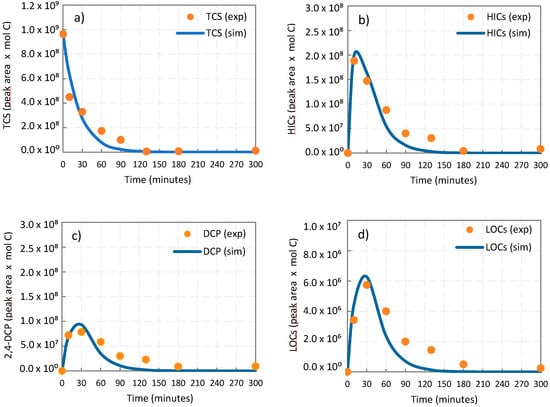 Fitting of simulated and experimental data of (a) TCS photocatalysis, (b) higher concentration derivatives (HICs), (c) 2,4-dichloropheno1 (DCP) and (d) lower concentration derivatives (LOCs).