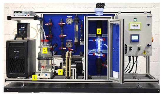 Experimental set-up, APRIA Systems; (1) mixing tank, (2) pump, (3) LED reactor and (4) magnetic stirrer.