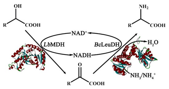 Scheme of the asymmetric biocatalytic preparation for UAAs from α-HAs via a hydrogen-borrowing dual-enzyme cascade composed of L. brevis D-mandelate dehydrogenase (LbMDH) and Bacillus cereus L-leucine dehydrogenase (BcLeuDH).