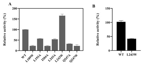 Screening of mutants. (A) relative activities of LbMDH wild type and the variants with D-α-hydroxybutyric acid as substrate; (B) relative activities of LbMDH wild type and L243W variant with D-mandelic acid as substrate. The enzyme activities towards D-hydroxybutanoic acid and D-mandelic acid of wild type were 243.5 and 60.2 U/mg, which were set to 100%, respectively. All assays were performed in triplicate.