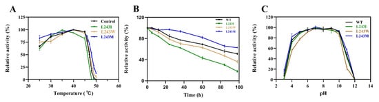 To study the enzymatic characteristics, we used D-mandelic acid as the model substrate. As showed in Figure 5A, the optimum temperature for L243I was 35 °C, while the optimum temperature for the wild type and other variants were 40 °C. Above 45 °C, the enzyme activity decreased sharply and the enzyme barely had any activity at 50 °C (Figure 5A), which indicated that the enzyme was not stable at high temperatures. The half-lives of thermal inactivation (t1/2) at 40 °C for LbMDH was 98.5 h, as showed in (Figure 5B, Figure S5), while only variant L243M showed improved t1/2 of about 140.2 h compared to that of the wild type—whereas, the substitution of L243W and L243I in LbMDH showed declined thermostabilities. Afterwards, the optimum pH of LbMDH and its variants were analyzed, and they all showed the highest activity under the condition of pH 10.0–11.0 (Figure S4). For the pH stability experiments, all the enzymes were stored at 4 °C in pH 3.0–12.0 buffer for 24 h (Figure 5C). The relative activity results revealed that the enzymes were highly stable in pH range 6.0–10.0 and were unstable when the pH was under 4.0 or above 10.0, except for the L243W mutation which had lower residual activity compared to other variants.