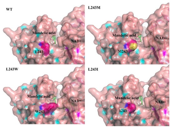 Structure analysis of LbMDH and the variants was carried out to study the reason for the different specific activities and affinities towards different substrates. Molecular docking of LbMDH and its variants together with D-mandelic acid and cofactor NAD were carried out by Autodock vina [33]. As showed in Figure 6, residue 243 was located at the substrate entrance channel and there were no inter-molecular hydrogen bonds between residue 243 and other residues. The replacement of Leu243 with Trp narrowed the substrate entrance channel, making the enzyme substrate entrance channel more favorable for substrates with small side chains. The L243M and L243I mutations also changed the size of entrance channel making it accessible by different substrates.