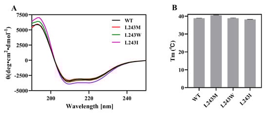 To verify the proper folding of LbMDH and its variants, the secondary structure was determined by circular dichroism. As shown in Figure 7, the far-UV CD spectrum of the four enzymes exhibited similar absorbance from 190 to 240 nm, with all showing positive peaks at 193 nm and two negative peaks at 209 nm and 219 nm, suggesting correct folding of the mutants [34,35]. To further study the temperature stability of LbMDH and variants, we measured the melting temperature (Tm) by monitoring their dichroic signal reduction at 220 nm at an elevated temperature from 20–70 °C. The variant L243M had a Tm value of 40.50 °C, which was 1.58 °C higher than that of the wild type, in line with the thermo-stability essay results for variant L243M.