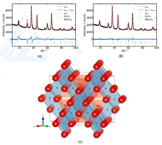 We analyzed the crystallographic structure of the calcined Ni/Al2O3-h sample via Rietveld refinement of powder X-ray diffraction (PXRD) data to understand the influence of the co-gelation synthesis procedure on the resulting structure. For the synthesis of Ni/Al2O3-h, the formation of a NiAl2O4 spinel phase was already known [15], while crystallographic details were not reported yet. However, this is important to properly understand the material as NiAl2O4 is a spinel structure and most transition Al2O3, e.g., γ or η-Al2O3, are typically described as defect-spinel structures [32,33,34,35]. As Ni/Al2O3-h is synthesized by co-gelation, an initially homogeneous distribution of Ni and Al can be expected. This raises the question of whether an Al2O3 transition form, NiO or NiAl2O4 as reported by Herwig et al. [15], is obtained upon calcination. From a qualitative analysis of the PXRD one can already exclude the formation of crystalline NiO. To get more insights into the formation of the Al2O3 transition form or NiAl2O4 we used Rietveld refinement. The resulting patterns for two different refinements of the same PXRD data set are shown in Figure 1a,b. An initial approach for the refinement was to use structure models of γ-Al2O3 by Zhou et al. and NiAl2O4 by O’Neill et al. without refinement of atomic parameters, which is shown in Figure 1a [33,36]. Compared to this, Figure 1b shows another refinement with the same structural models as above, but with refinement of occupancy of the Al positions of the γ-Al2O3 transition form. From the refined patterns, one can directly see that the occupancy refinement (Figure 1b) led to a better fit compared to fixed occupancies (Figure 1a). Other potentially matching Al2O3 transition forms such as η-Al2O3 by Zhou et al. were also tested for refinement but led to worse results [33].