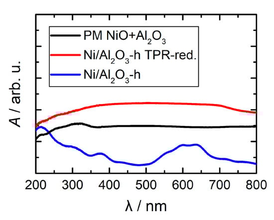 Diffuse reflectance ultraviolet-visible (DRUV/vis) spectra of a physical mixture (PM) of NiO and γ-Al2O3 (PM, in black), H2-temperature programmed reduction (TPR)-reduced Ni/Al2O3-h (TPR-red., in red) and Ni/Al2O3-h after calcination (in blue).