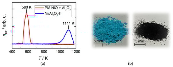 (a) H2-TPR curves of Ni/Al2O3-h and a physical mixture of NiO and Al2O3 (ωNi = 16.3 wt.%); (b) photographs of Ni/Al2O3-h prior to (blue) and after reduction by H2-TPR (black).