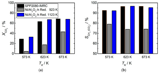 CO2 conversion (a) and selectivity for CH4 (b) in the methanation of CO2 over the reference catalyst SPP2080-IMRC and Ni/Al2O3-h, reduced at 923 K or 1123 K after 7–13 h on stream at different reaction temperatures (TR). The volume ratio of reactive gases was / = 4/1.