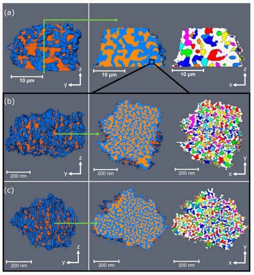 The separated pores (8-bit color code), total pore (orange), and material (blue) labels for both the ET and PXCT volumes were quantitatively analyzed to retrieve porosity descriptors for the Ni/Al2O3-h catalyst. From the label analysis using Avizo we retrieved information such as volume and surface area for the material and total pore labels, as well as the equivalent pore diameter deq (Equation (4)) for each individual pore label, as shown in Figure 5a–c for the PXCT and ET volumes, respectively. The rounded total pore Vp,tot and material volumes Vs,tot are listed in Table 1 together with the total porosity εtomo of each tomogram. All three tomograms show a porosity larger than 40%. With respect to the resolution, εtomo of the PXCT is defined as the macroporosity εM of the Ni/Al2O3-h catalyst based on image analysis. To calculate the total porosity εtot of the material based on the tomography studies, the mesoporosity visible by ET must also be included. Therefore, the porosity of the material label in PXCT was assumed to further contain the average of the porosity values obtained from ET, which was 44.9%. Taking into account this extra porosity for the PXCT results, a εtot of 70.4% was obtained. Based on this εtot, the mesoporosity εm of the Ni/Al2O3-h catalyst based on the tomography analysis was 24.1%.