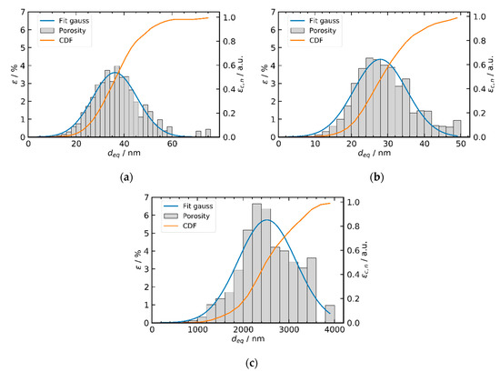 Sum of individual porosities ε (grey) depending on deq as obtained from image analysis of the three different tomograms (a) ET1, (b) ET2, and (c) PXCT of the Ni/Al2O3-h catalysts together with the normalized cumulative distribution function of the porosity εc,n (orange) and a fitted Gaussian distribution function (blue).