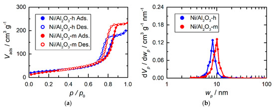 The textural properties of Ni/Al2O3-h were also studied using well-established characterization techniques, i.e., N2 sorption and Hg porosimetry. For these conventional techniques, a purely mesoporous Ni/Al2O3-m sample, prepared via the same method but without addition of PEG, was used for comparison. The Ni/Al2O3-m sample contained a similar amount of 18.6 wt.% Ni as the Ni/Al2O3-h. According to the IUPAC definition [48], the N2 sorption isotherms displayed in Figure 7a can be classified as type IV isotherms with a H1 hysteresis, indicating mesoporous materials. Indeed, narrow pore width distributions (Figure 7b) with maxima at 8.3 nm and 10.3 nm were obtained, respectively. The different mesopore widths for these materials were most likely caused by the influences of the polymerization-induced phase separation on the gelation process, which was induced in Ni/Al2O3-h but not in Ni/Al2O3-m.