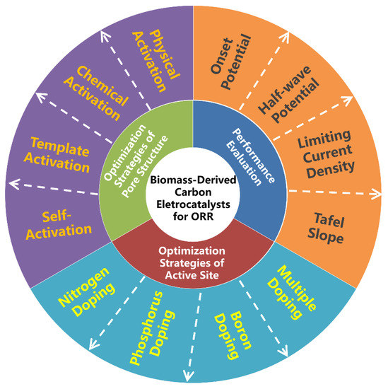 There have been several valuable reviews on the achievements of biomass-derived carbon electrocatalysts including their preparation, physicochemical properties and ORR applications [25,44,45,46,47]. However, the progress focusing on the optimization strategies of pore structure and active site for oxygen electroreduction has not been specifically summarized yet. Moreover, this research field is developing rapidly. Therefore, it is highly essential to provide a timely review as well as in-depth understanding of optimization strategies on ORR performance by considering them in entirety (Figure 1). In this timely review, we have comprehensively discussed the performance evaluation of ORR process, optimization strategies of pore structures and active sites in biomass-derived carbon electrocatalysts for oxygen electroreduction. First, the performance evaluation of biomass-derived carbon electrocatalysts in ORR process has been presented, which is theoretical foundation, and some critical parameters including onset potential, half-wave potential, limiting current density and Tafel slope have been highlighted. Then, several recent advances of commonly used optimization strategies of pore structures and active sites to enhance the electrochemical performance have been systematically discussed, such as (i) physical activation, chemical activation, template activation and self-activation, (ii) nitrogen doping, phosphorus doping, boron doping, and multiple doping. Such aforementioned optimization strategies greatly improve the electrocatalytic activity of biomass-derived carbon electrocatalysts, which hold a promising potential for ORR-related applications. In addition, the current challenges and future prospects of biomass-derived carbon electrocatalysts for ORR have also been discussed in detail.