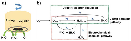 Generally, two ORR pathways have been proposed: one is the direct four-electron (4e−) reduction pathway, the other is the indirect two-electron (2e−) peroxide pathway (Figure 2b) [44]. O2 can be directly reduced to H2O through the 4e− pathway with a rate constant k1; alternatively, it can also be reduced to adsorbed hydrogen peroxide (H2O2,ad) through the 2e− pathway with a rate constant k2 (HO2− in alkaline medium and H2O2 in acidic medium). The amount of H2O2 was calculated according to Equation (1). Subsequently, H2O2,ad could either be electrochemically reduced to H2O with a rate constant k3, or could be chemically decomposed to O2,ad with a rate constant k4 on surface, and desorbed into electrolyte with a rate constant k5. The suitable electrocatalyst drives the ORR process towards direct 4e− reduction pathway, which requires high current efficiency and fewer peroxide species [53]. The selectivity of the electrocatalyst is usually described with the number (n) of transferred electrons, which can be calculated by K-L equation and RRDE measurement [54]. The number (n) was calculated according to Equation (2).