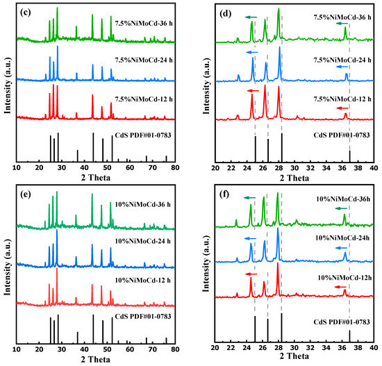 The powder X-ray diffraction (XRD) patterns of x%(NiMo6)@CdS-τ (x = 5, 7.5, 10, τ = 12, 24, 36 h) composites are shown in Figure 1a–f, respectively. Although, after modification with variable amounts of NiMo6 precursor and variable hydrothermal time, all XRD patterns turned out to be similar and all peaks of pristine CdS could be obviously detected in Figure 1a,c,e, according to Jade card No.01-0783. It implies that the introduction of Ni and Mo shows little influence on the bulk CdS structure. Despite this, Ni, Mo co-doping increases the lattice constant of the CdS structure, resulting in a small peak shift towards a lower angle, as shown in Figure 1b,d,f. Nonetheless, the crystalline structure of Ni and Mo species was still uncertain from the above XRD patterns, and hereafter, identified by X-ray photoelectron spectrum (XPS) measurements that will be discussed later.
