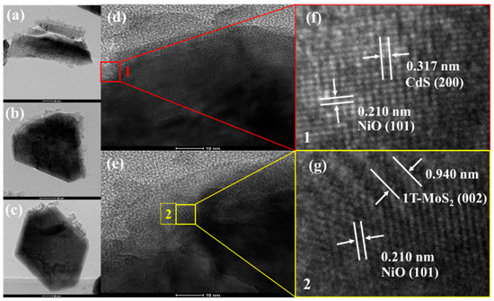 HRTEM images of 5%(NiMo6)@CdS-24 h composite. (a–c) HRTEM images with a scale bar of 50 nm. (d,e) HRTEM images with a scale bar of 10 nm. (f,g) Amplified specific regions in (f) red square box 1 and (g) yellow square box 2 derived from (d,e), respectively.
