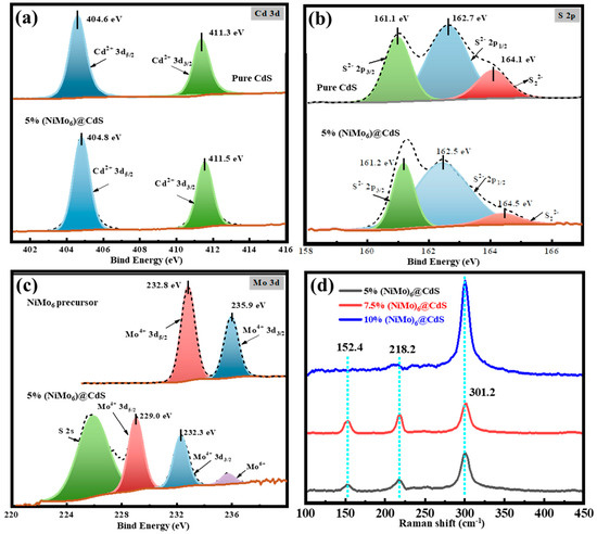 X-ray photoelectron spectrum of 5%(NiMo6)@CdS-24 h composite, (a) Cd spectrum, (b) S spectrum, (c) Mo spectrum. (d) Raman spectra of x%(NiMo6)@CdS-24 h composites.