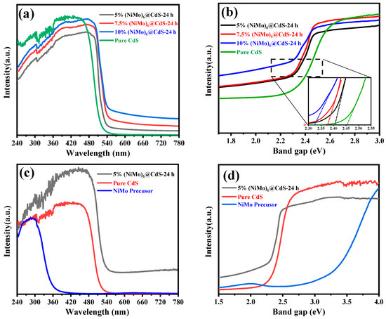 As the first step of the three main steps in photocatalysis, the optical absorption of photocatalysts is of necessity to enhance photocatalytic performance [31], which can be reflected by UV-vis diffuse reflection spectrum (UV-vis DRS). As illustrated in Figure 6a, pure CdS and 10%(NiMo6)@CdS-24 h samples had an approximate band edge position at nearly 515 and 555 nm, respectively. The absorption band edge positions of 5% and 7.5%(NiMo6)@CdS-24 h samples were at around 540 nm. According to the Tauc plot method, the band gap of semiconductor catalysts was calculated. As presented in Figure 6b, the 10%(NiMo6)@CdS-24 h sample had a band gap at around 2.24 eV, which was narrower than 5% (2.32 eV), 7.5%(NiMo6)@CdS-24 h samples (2.28 eV) and pure CdS (2.40 eV). Moreover, the light absorption ability of 5%(NiMo6)@CdS-24 h composite was superior to the pristine CdS photocatalyst and NiMo6 precursor in Figure 6c,d. Therefore, the modification with NiO/1T-MoS2 on bulk CdS photocatalyst broadened the absorption of the light wavelength range [27,32]. The enhancement of absorption ability can be attributed to the heterojunction among NiO, 1T-MoS2 and CdS [32,33]. Additionally, the tailing region of light absorption was intensified, which could be ascribed to the increasing amount of MoS2 with a broad absorption range in visible light [34,35].
