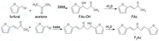 The aldol condensation yields in molecules with longer carbon chains, which in some cases may be used as renewable fuel components, after being hydrogenated. Furfural is a low molecular weight keto-compound possibly derived from biomass, which can be converted with acetone to C8 and C13 compounds such as 4-(2-furyl)-4-hydroxybutane-2-one (FAc-OH), which subsequently reacts to 4-(2-furyl)-3-butene-2-one (FAc) and 1,4-pentadiene-3-on-1,5-di-2-furanyl (F2Ac) (Figure 1) [11,12],. Furfural is produced by acid-catalyzed decomposition of hemicellulose rich sources like bagasse, rice husk, corn cobs or sugarcane [13]. Alternatively, acetone is produced as a by-product in phenol production. New methods of producing acetone from biomass are currently being investigated using enzymatic catalysis [14].