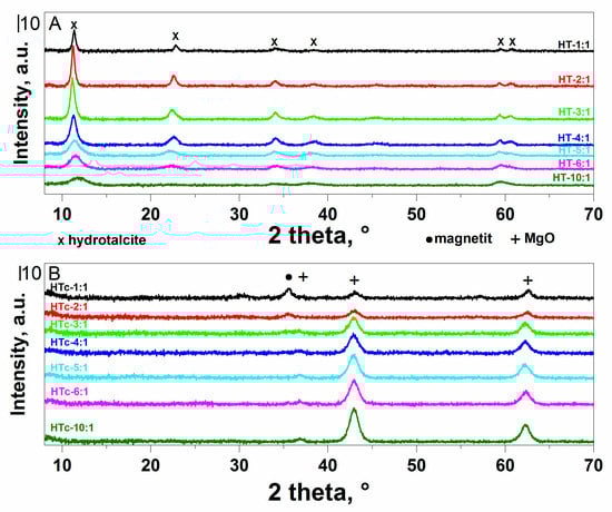The LDH structure of the products of precipitation was confirmed by XRD. The XRD patterns of LDHs with different Mg/Fe molar ratio are depicted in Figure 2A, where the diffraction lines at 2θ = 10.4°, 22.8°, 34.1°, 38.4°, 45.5°, 59.3° and 60.6°, typical for double layered hydroxides, can be seen [15]. The LDHs with the Mg/Fe molar ratio in the range from 1:1 to 4:1 are represented by sharp, intensive and symmetric diffraction lines, which indicate well ordered crystal structure of the samples. For higher Mg/Fe molar ratio, the diffraction lines are less sharp and symmetric which is more and more apparent with increasing magnesium content.