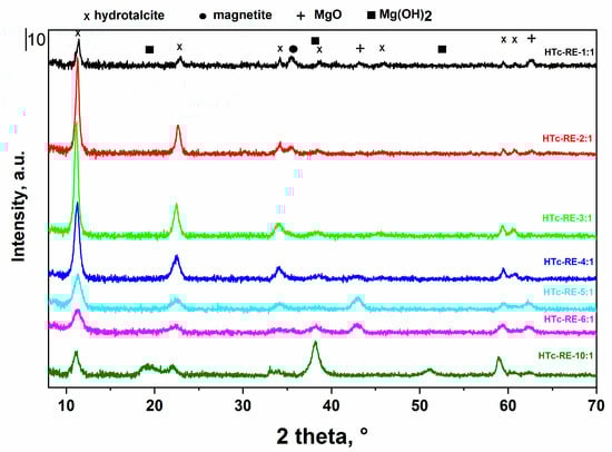 Scherrer equation was used for calculation of crystal size, which was determined by the diffraction line at 2θ = 10.4°. The crystal size decreased from 22 to 5 nm with the Mg/Fe molar ratio increase. The differences were observed in the HTc-RE-1:1 and HTc-Re-10:1, where the crystal size values were determined as 17 nm and 10 nm, respectively.