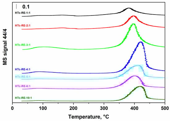 The temperature-programmed desorption of probe molecules CO2 (CO2-TPD) was performed by Micromeritics AutoChem II 2920 (Micromeritics Instrument Corp., Norcross, GA, USA) equipped with a mass spectrometer Pfeiffer Vacuum OmniStarTM GSD 320 (Pfeiffer Vacuum, Prague, Czech Republic). Approximately, 100 mg of the rehydrated mixed oxide was inserted in a quartz reactor. The degassing was carried out at 100 °C (10 °C∙min−1) for 5 min in a flow of helium (25 mL∙min−1). Then the temperature was decreased to 25 °C and the rehydrated mixed oxide was saturated in a flow of gas mixture (10 vol% of CO2 in helium) for 30 min. The physically adsorbed molecules of CO2 were removed by purging of helium flow for 60 min. Finely, the desorption was carried out under linear heating of the rehydrated mixed oxides (10 °C∙min−1) in a flow of He (25 mL∙min−1).