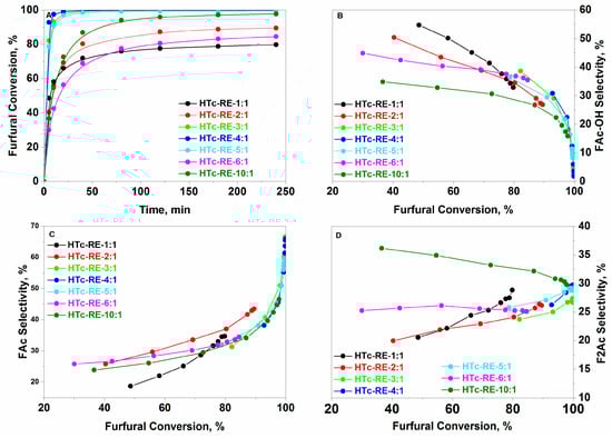 Furfural conversion (A) and main products selectivity ((B) = FAc-OH; (C) = FAc; (D) = F2Ac).