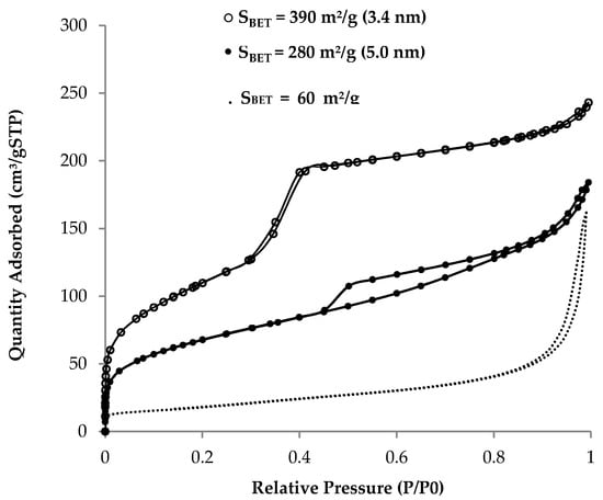 Nitrogen adsorption/desorption isotherms of (○) Ru/CB@SiO2(C) and (•) Ru/CB@SiO2(P) materials in comparison with the starting uncovered Ru/CB (dotted line) catalyst.