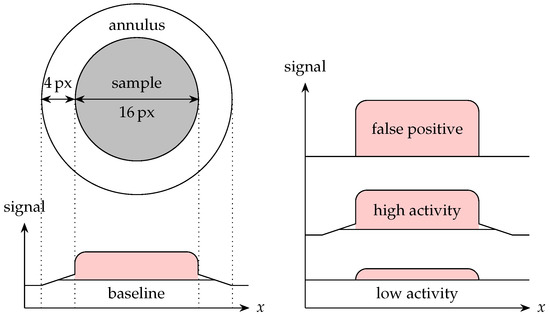Usually only one component is removed from the gas mixture for emission correction and temperature calibration. Preliminary experiments showed fewer artifacts when the emission correction image is recorded in N2 after the reaction in comparison to an image recorded in a mixture of O2 and N2 prior to the reaction. Using wet O2/N2 mixture as background resulted in many samples showing high (apparent) temperature increases, but no change of temperature in the surrounding slate plate, i.e., frequently false positive results. These apparent temperature changes would disturb the measurement. Other examples of artifacts can be found in literature [59,60].