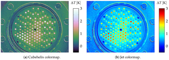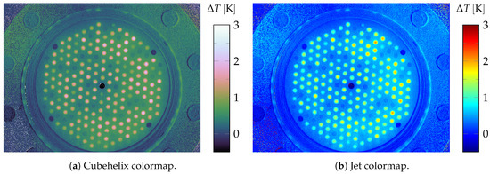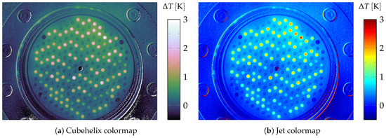 The principles of this method including advantages, disadvantages and possible errors, have been described in detail in previous publications [58,59,60,61]. Nevertheless, we will give a short overview here. Bodies in this study are assumed to be emitting radiation based on their temperature. This radiation can be described by Kirchhoff’s law of thermal radiation, Planck’s law and Stefan–Boltzmann law. The radiation of a real body can be described using a black body as a model system and a coefficient describing the “imperfection” of a real body. The factor connecting both is called emissivity ε . It is possible to correct for the different individual emissivities of each sample by calibration. To make the temperature differences under reaction conditions visible, typically, the difference between an image recorded under an inert atmosphere is subtracted from an image recorded under the reaction atmosphere. Combining this differential image with the temperature calibration mentioned previously resulted in an ecIRT image. A custom color scale can be applied to those images to differentiate between areas. The jet colormap as well as a cubehelix colormap have been used, each having different advantages and drawbacks [62,63].