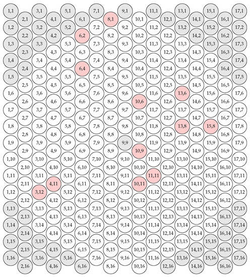 Figure 4. Position of promising samples due to high Δ T value (red background) from composition range Pt3 Ala Mnb Cec on slate library plate 1. Wells with gray background are not present on the plate.