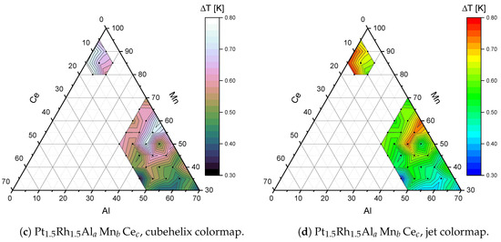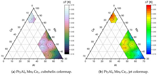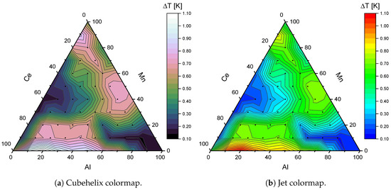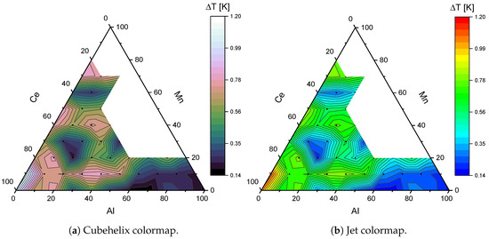 Figure 8. Average Δ T values for samples from composition spread library 2 with given composition, measured using ecIRT. Axis labels denoting the mole fraction χ of given element as percentage, e.g., Al representing χ Al = n Al n Al + n Mn + n Ce , PM are excluded from this calculation. Sample compositions are displayed by a dot and values between dots are generated using linear interpolation.
