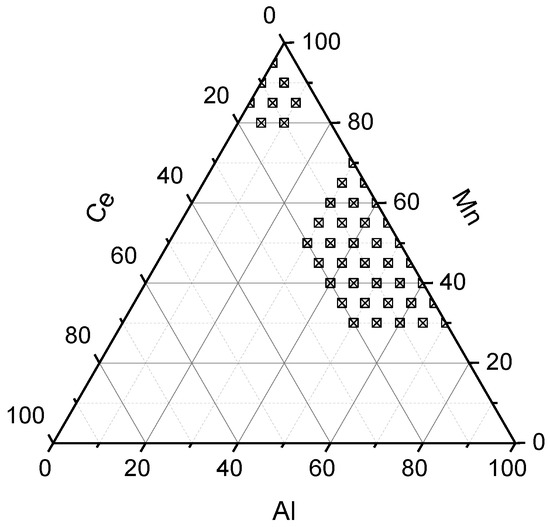 Areas with promising samples are similar to those from Figure 5. Pt1.5 Rh1.5 Al40 Mn60 Ce0, Pt1.5 Rh1.5 Al0 Mn90 Ce10, Pt1.5 Rh1.5 Al30 Mn10 Ce60, and Pt1.5 Rh1.5 Al0 Mn0 Ce100 have a similar composition to the previously mentioned samples from the composition range Pt3 Ala Mnb Cec. In addition, promising samples could be identified as Pt1.5 Rh1.5 Al20 Mn40 Ce40 and Pt1.5 Rh1.5 Al0 Mn50 Ce50.