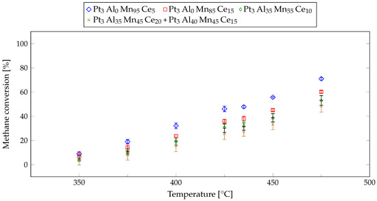 Figure 13. Methane conversion at different temperatures for samples from from composition range Pt3 Ala Mnb Cec from Table 2. 12.5 vol.% H2O, 12.5 vol.% CO2, 9.0 vol.% O2, 0.25 vol.% CH4, 0.055 vol.% CO, 0.012 vol.% NO, 0.004 vol.% NO2, 0.001 vol.% SO2, balance He, WHSV = 36,000 mL/(g h). Error bars represent standard deviation ( n = 3 ) as given by Equation (2).