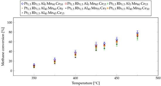 Figure 14. Methane conversion at different temperatures for samples from from composition range Pt1.5 Rh1.5 Ala Mnb Cec from Table 3. 12.5 vol.% H2O, 12.5 vol.% CO2, 9.0 vol.% O2, 0.25 vol.% CH4, 0.055 vol.% CO, 0.012 vol.% NO, 0.004 vol.% NO2, 0.001 vol.% SO2, balance He, WHSV = 36,000 mL/(g h). Error bars represent standard deviation ( n = 3 ) as given by Equation (2).