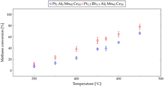 In Figure 15, the displayed error bars for the sample Pt1.5 Rh1.5 Al0 Mn90 Ce10 are larger than those for the sample Pt3 Al0 Mn90 Ce10, especially at temperatures higher than 400 °C. This larger error bars result from a decrease in methane conversion over time at the given temperature. The first of three GC measurements at a given temperature always revealed highest methane conversion, whereas the one recorded about 30 min later had already decreased in performance. The decrease of performance at constant temperature over 30 min is usually in the range of 6 to 11 percentage points. This behavior can be observed for six out of seven Pt1.5 Rh1.5 containing samples, but only for two out of five Pt3-containing samples. Gélin et al. reported a drop in conversion for Pt/Al2O3 samples when measured at constant temperature for 1 h [12], a similar phenomenon might be the reason for the observed behavior of some samples.