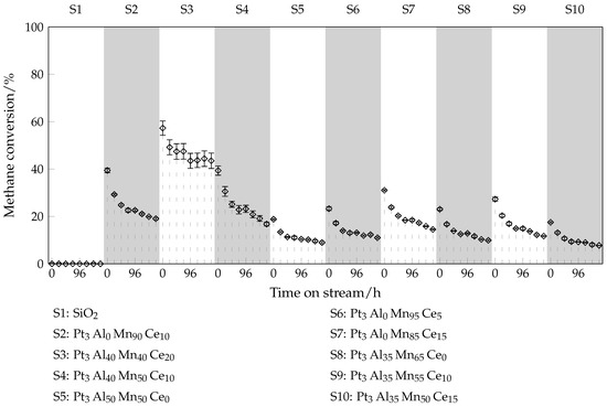 Figure 17. Methane conversion as function of time on stream up to 168 h of selected samples from systems Pt3 Ala Mnb Cec. 0.5 vol.% CH4, 9.0 vol.% O2, 12.5 vol.% CO2, 0.001 vol.% SO2, 12.5 vol.% H2O, balance N2; 450 °C, WHSV = 72,000 mL/(g h). Error bars represent standard deviation ( n = 3 ) as given by Equation (2).