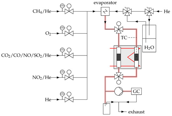 Methane has a global warming potential (greenhouse effect) that is said to be 10–86 times higher than carbon dioxide, therefore, methane emissions should be reduced [2,3]. Methane-emitting sources have various gas compositions and other process values that affect possible methods to reduce emission. Some of these parameters—among others—are gas temperature, emitted volume, and steady-state/cyclic operation. Different situations demand individual approaches to handle methane emissions; in larger applications (e.g., large chemical plants), a torch might be feasible, whereas in smaller applications (e.g., transportation sector), a catalytic converter is likely to be better suited. The catalytic total oxidation of methane has been in the focus of research for quite some time [4,5]. Many recent publications focus on palladium-containing catalysts [6,7,8,9,10,11,12,13,14,15,16,17,18,19,20,21,22,23,24,25,26,27,28,29,30,31,32,33,34,35,36,37,38] or try to find other precious metal (PM) [12,39,40,41,42,43,44,45] and PM-free catalysts [46,47,48,49,50,51,52,53,54,55].