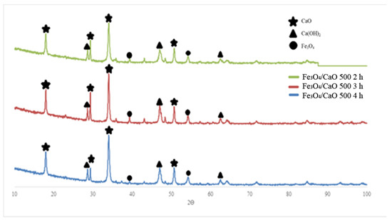 XRD pattern of obtained Fe3O4/CaO catalyst at a dehydration temperature of 500 °C with various dehydration times of 2 h, 3 h, and 4 h, respectively.