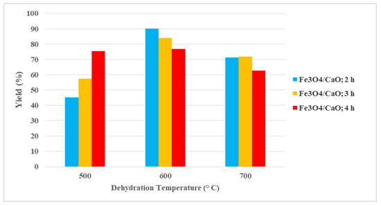To understand how the temperature and dehydration time influence the activity of the Fe3O4/CaO catalyst, the transesterification process was designed in this experiment with the experimental conditions are consisted of 10:1 for the methanol oil molar ratio, the catalyst weight of 1% (wt.), the reaction temperature of 70 °C, and the reaction time of 2 h. Figure 3 showed the yield of biodiesel resulted in this experiment.